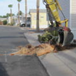Down came the poor dead palm tree that was hit by lightning a few weeks ago. The amazing structure of a palm tree becomes evident when you see how fibrous it is inside rather than consisting of the concentric circles like a regular hardwood tree. The trunk also contains an amazing amount of water as witnessed by two of the photos below where you can see water dripping from the trunk as it is lifted away and by the large puddle it left on the street. (Click on ‘view slide show’ to see each photo)