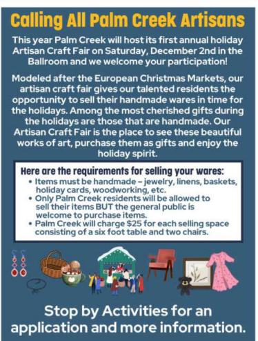 What makes this event so special is that all the sales will be items created by our own Creekers! As I visited so many patios today, I was so impressed with all the items created by our residents. I copied the info from the Activities poster: